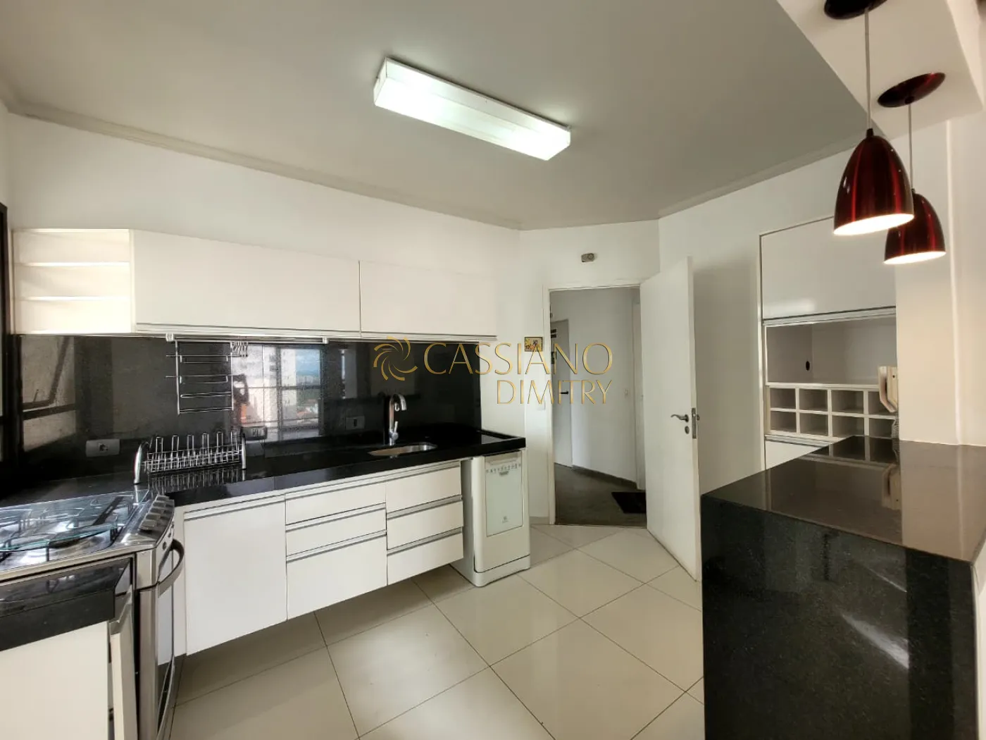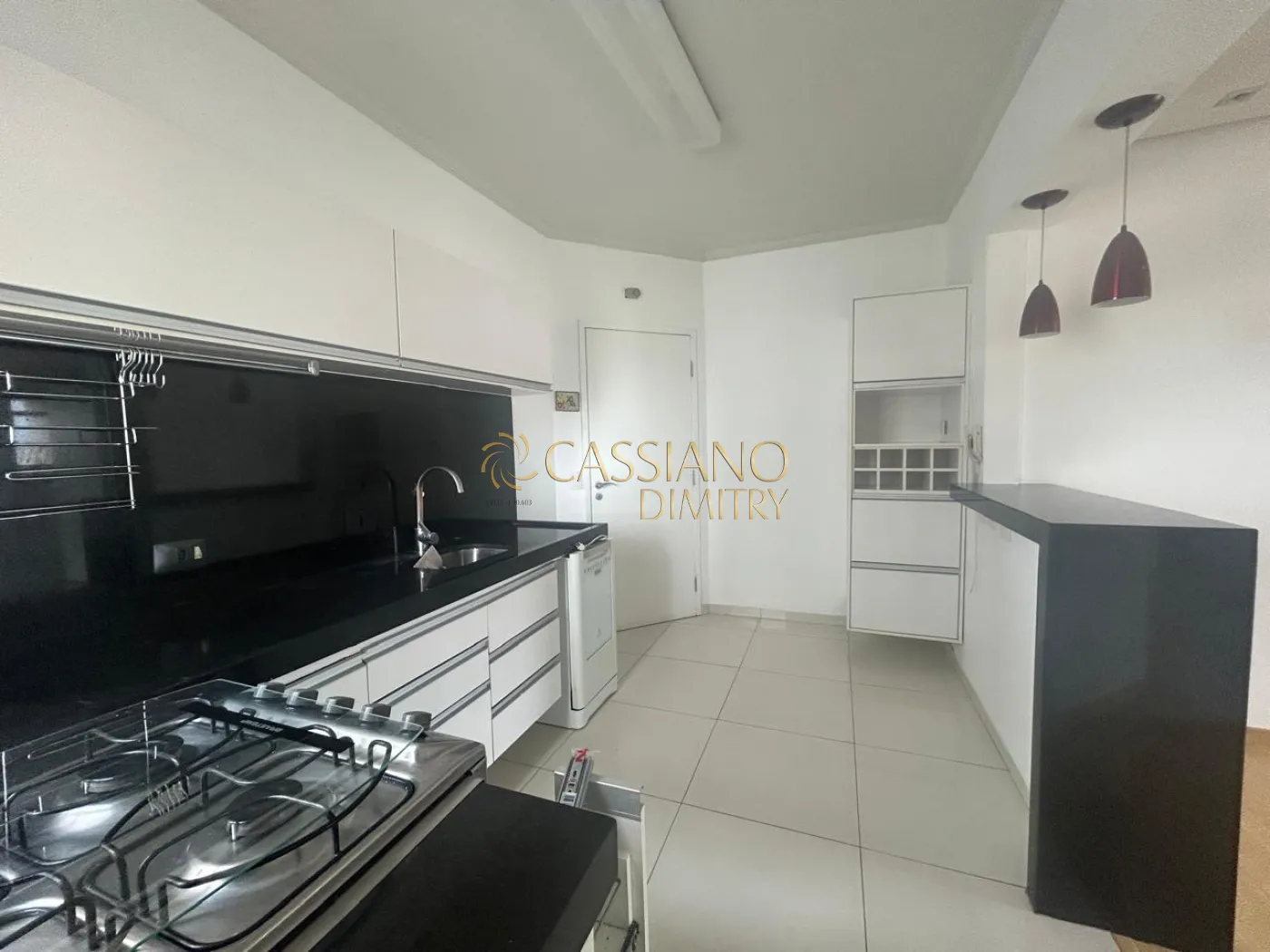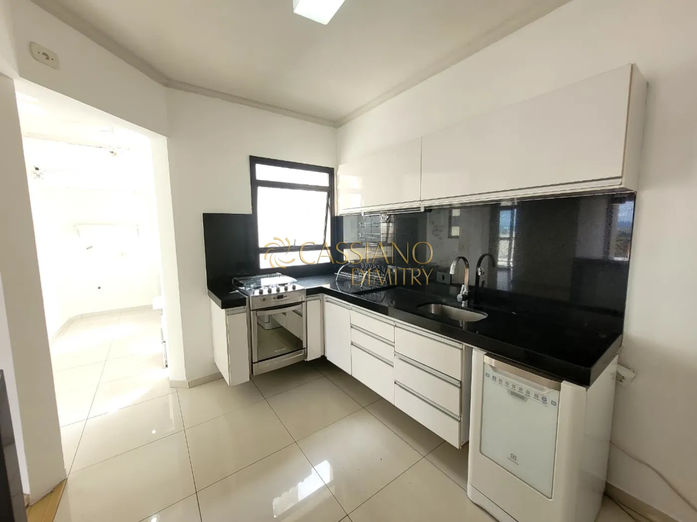 - Cozinha com armários, fogão e maquina de lavar