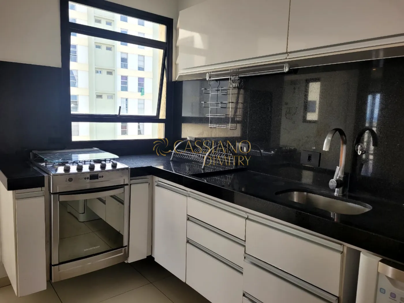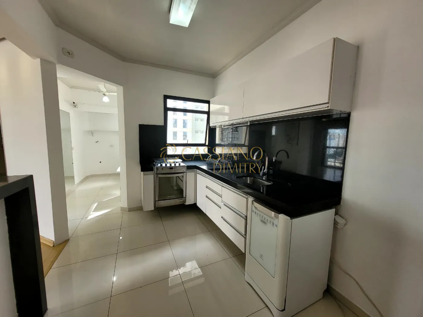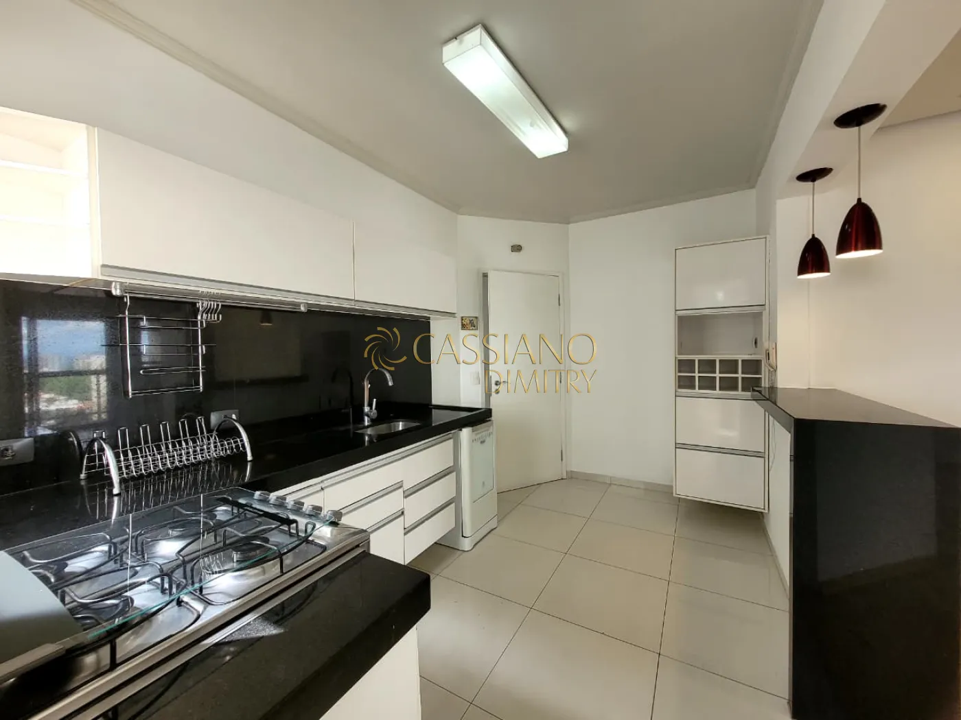 - Cozinha com armários, fogão e maquina de lavar