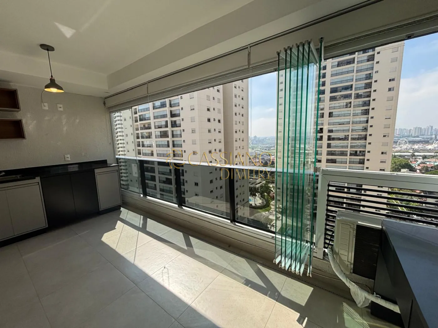 - Varanda com cortina de vidro e tecido, armários e pia;