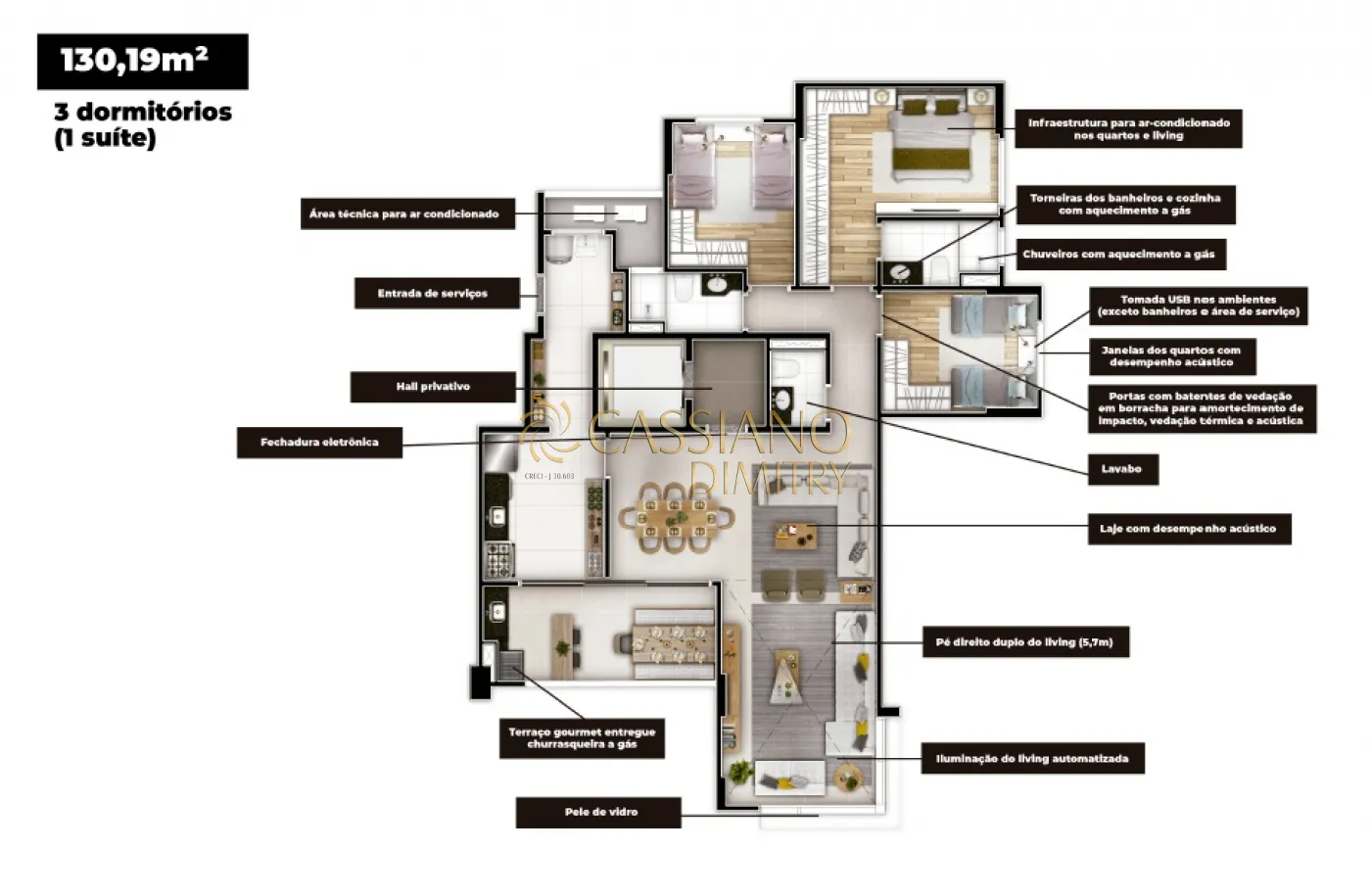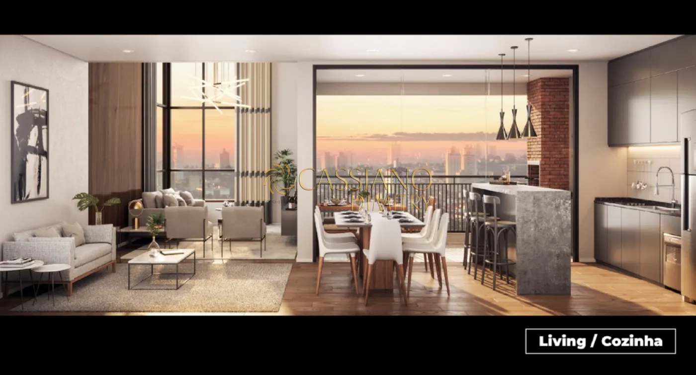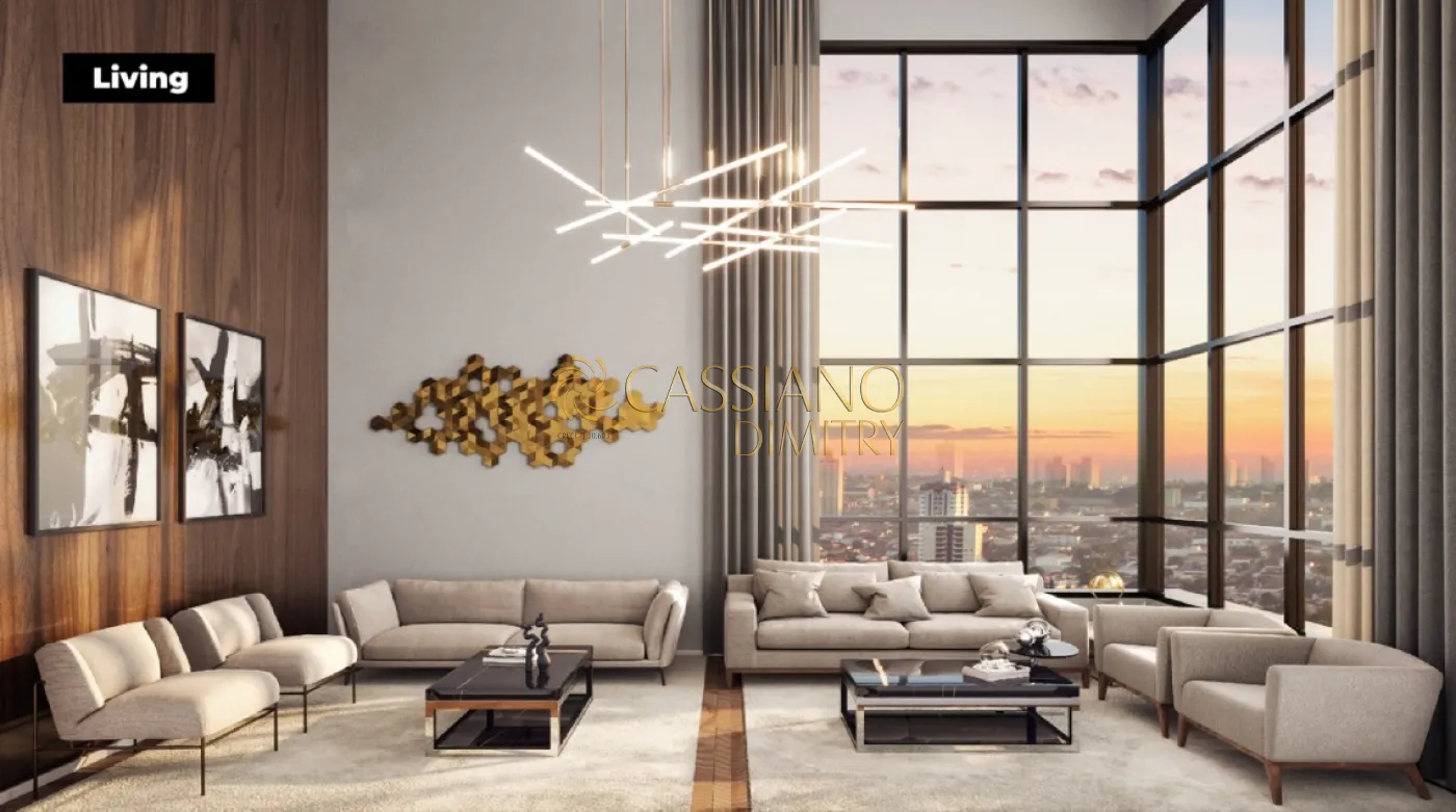 Apartamentos de 3 dormitórios (suíte) com opções de 130 e 136m², living com pé-direito duplo (5,7m de altura), terraço gourmet com churrasqueira a gás e lazer completo:
