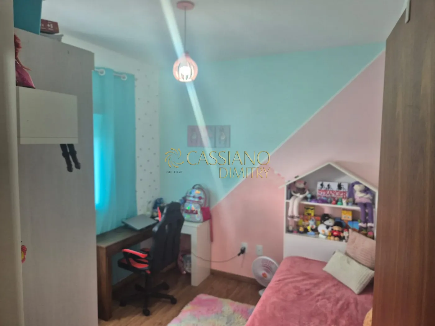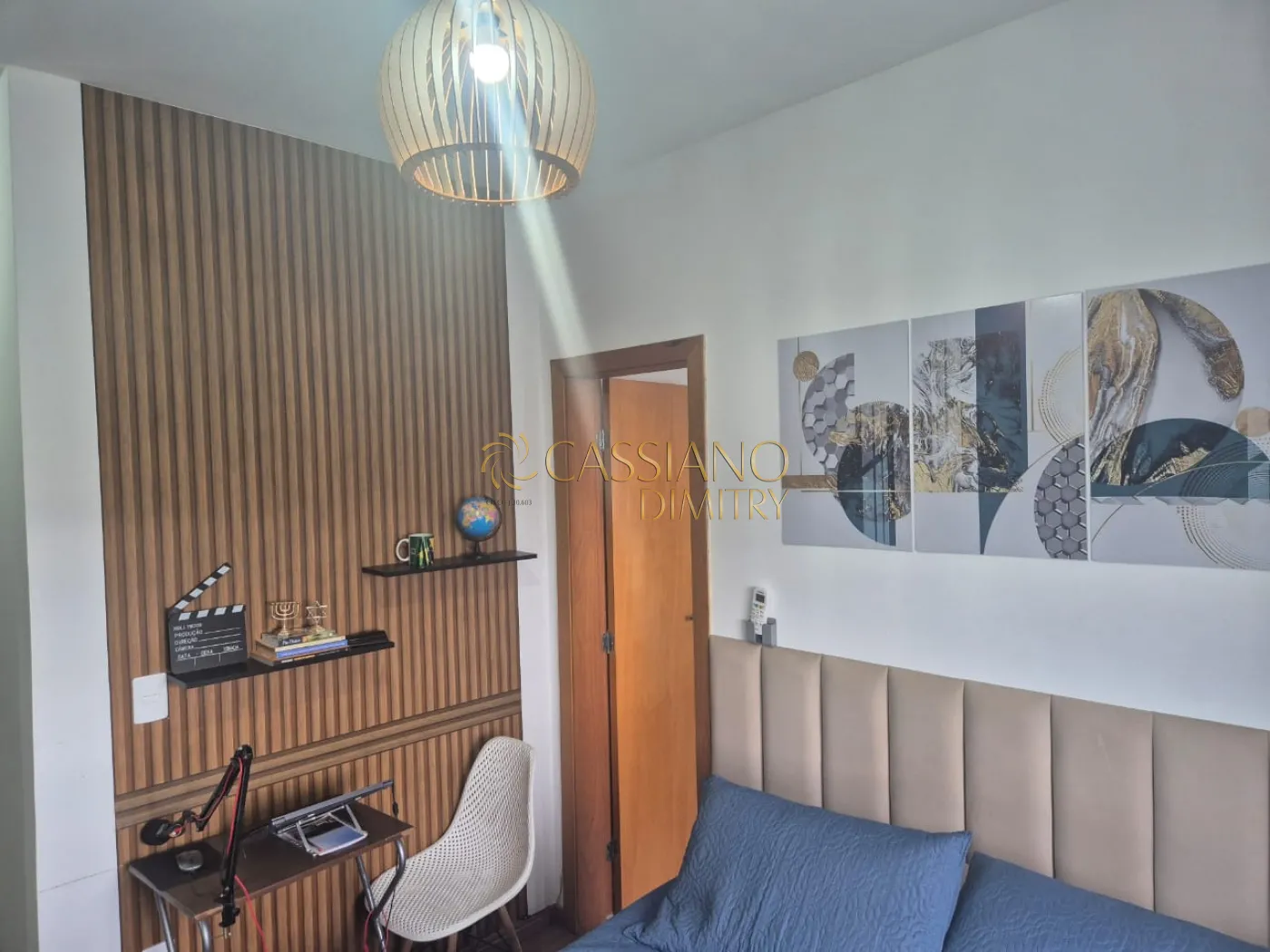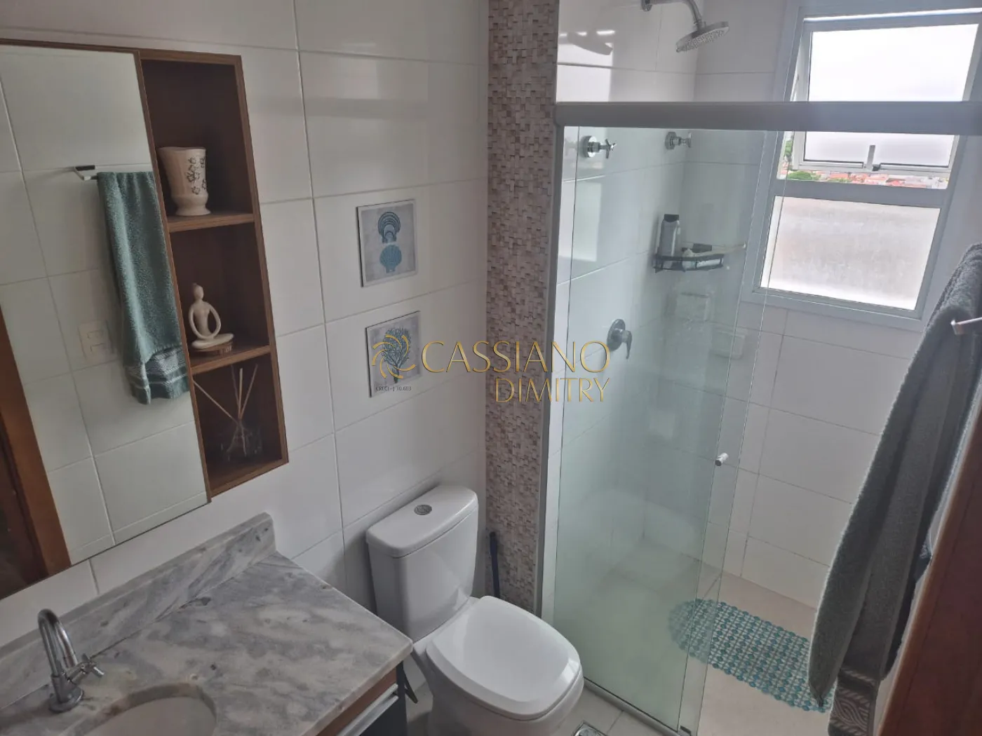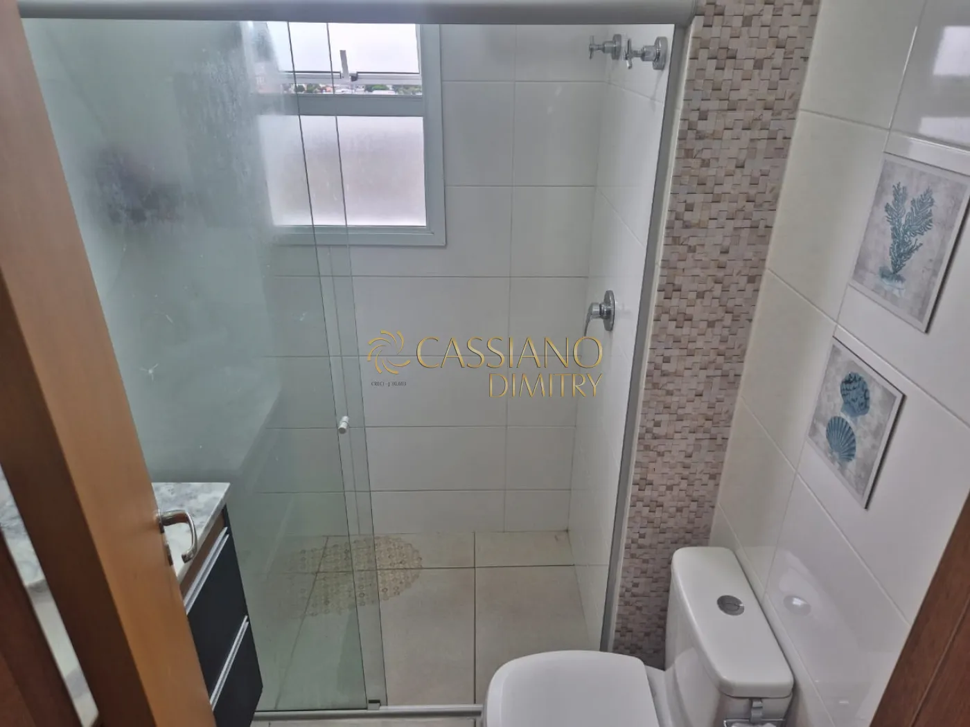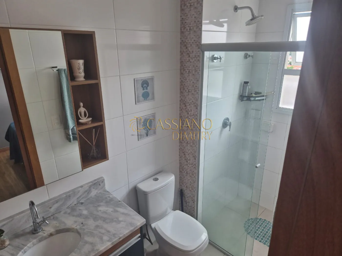 - Suíte e banheiro social com box e gabinete;