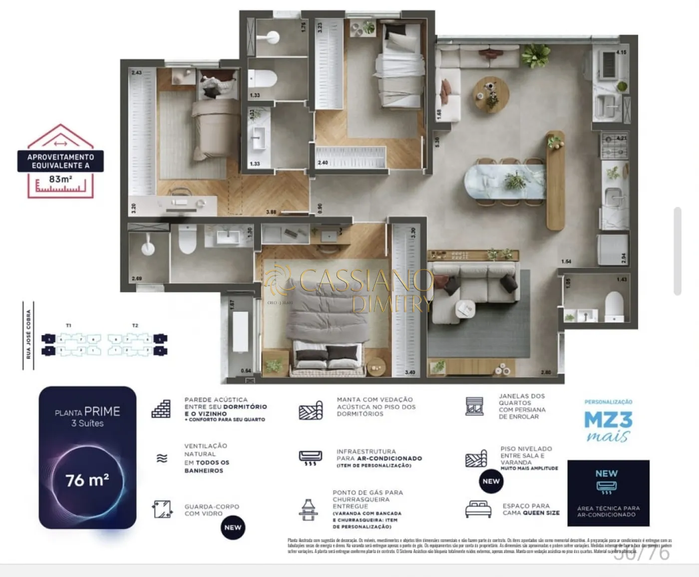 Planta Prime com 76m², 3 Dormitórios, suíte, lavabo. 2 vagas de garagem. Andar alto, posição privilegiada.
