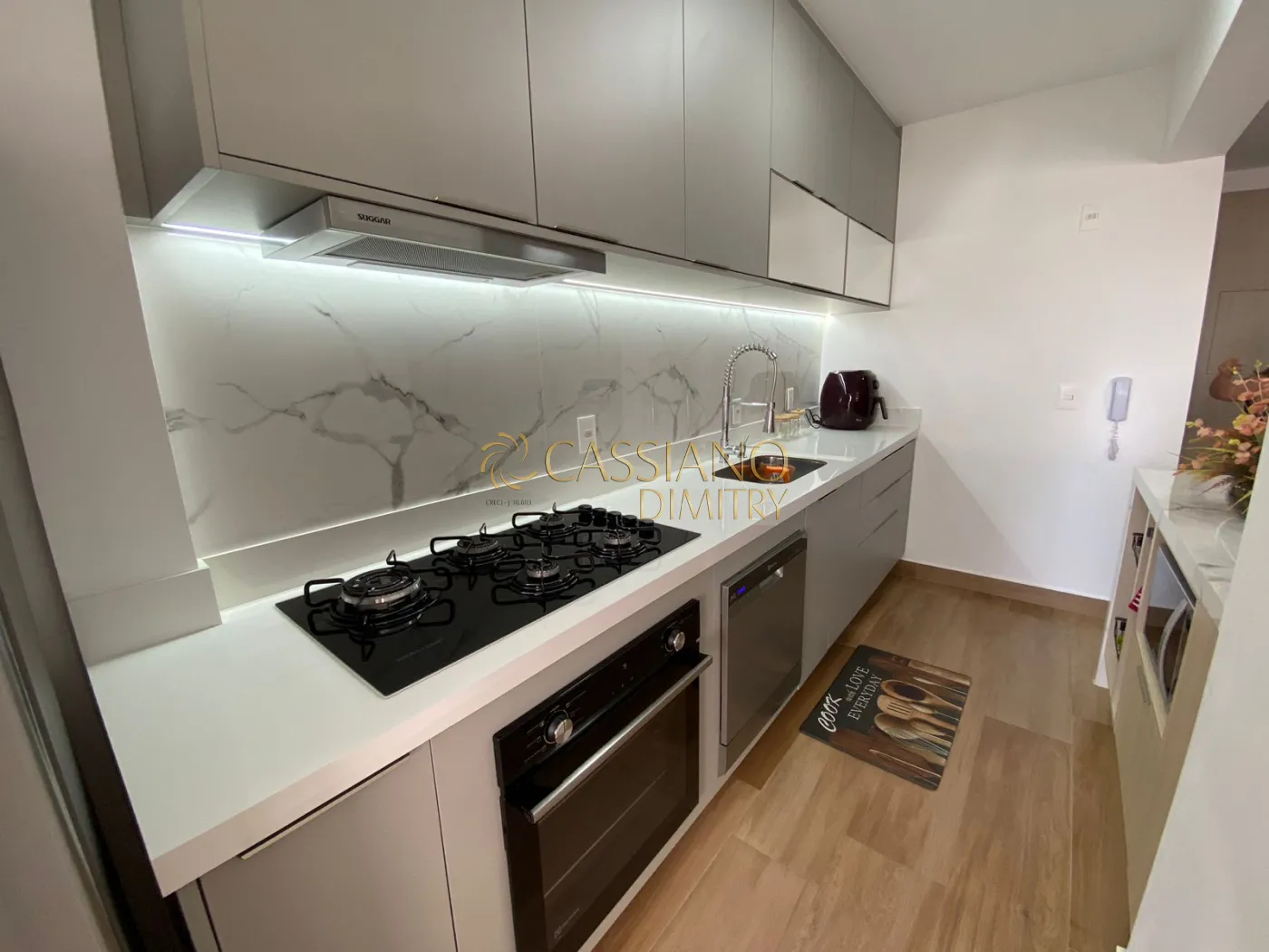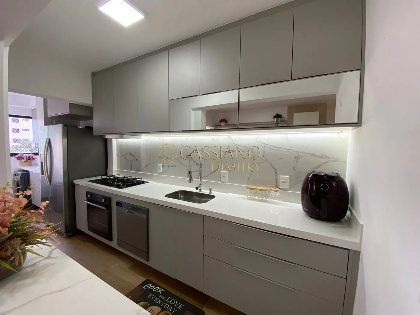 - Cozinha com piso porcelanato e móveis planejados Dalmobile;