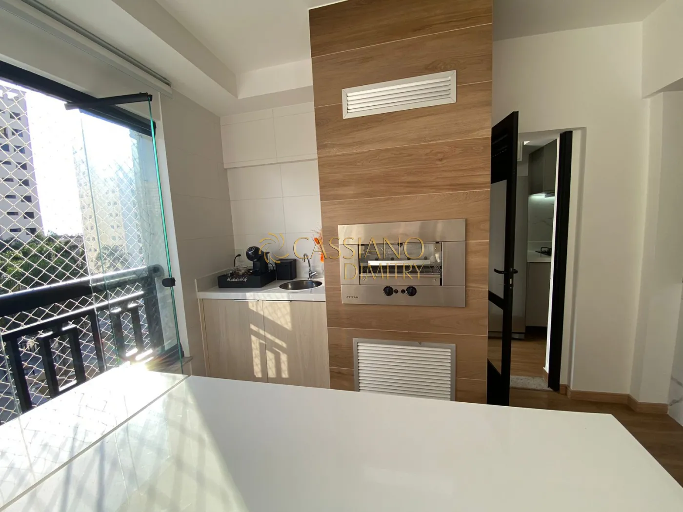 Varanda Gourmet equipada com churrasqueira a gás e ponto de TV;