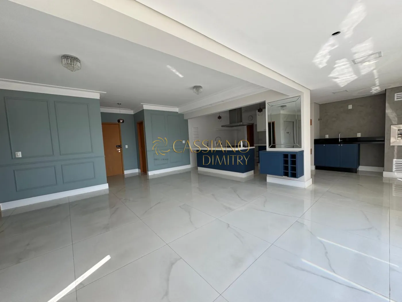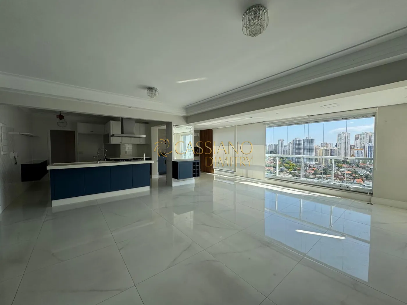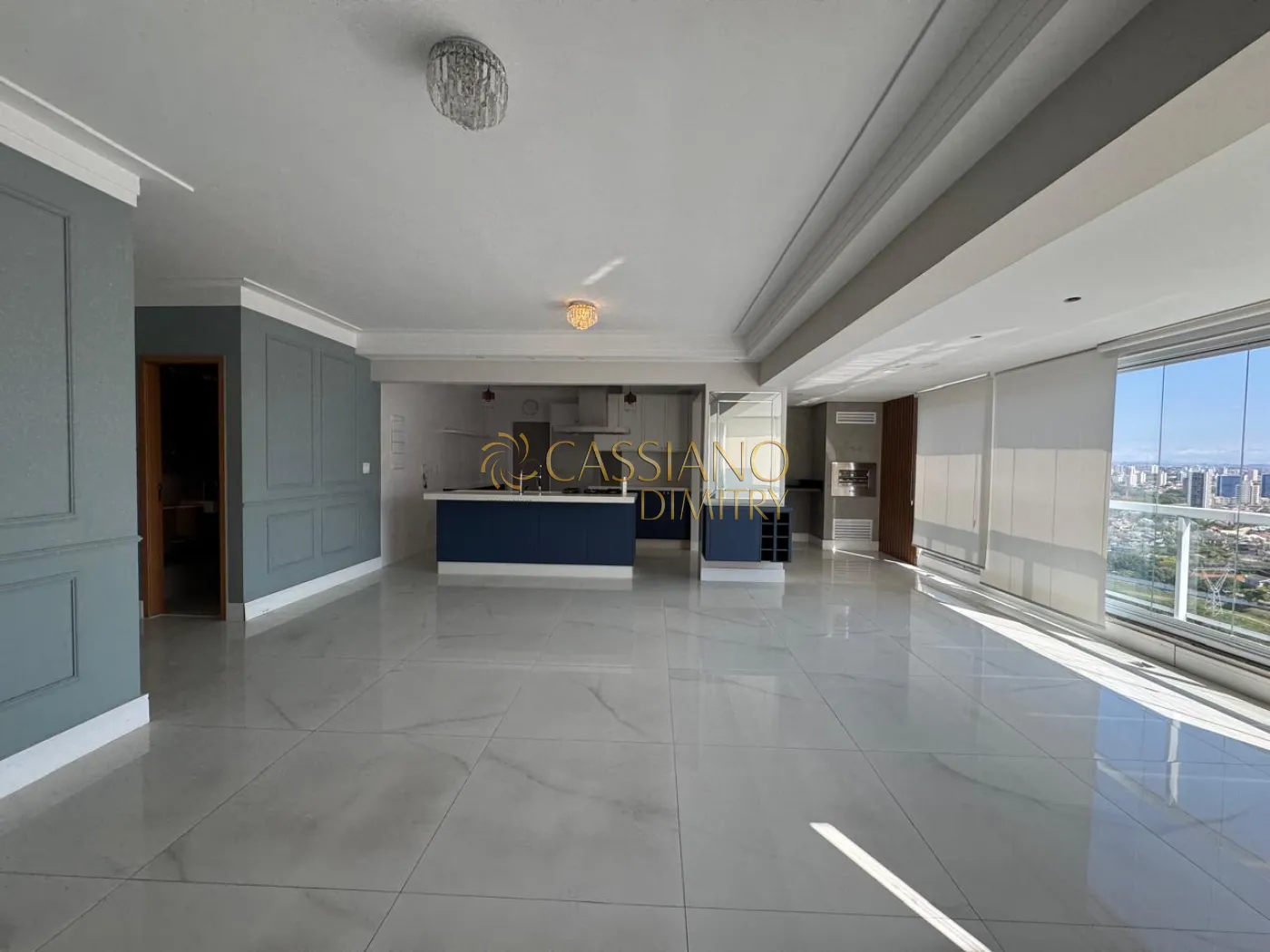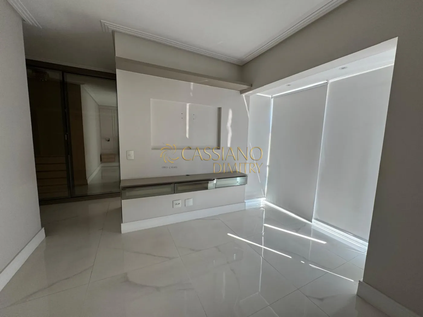 - Living amplo com piso em porcelanato polido, marcenaria sob medida e iluminação;