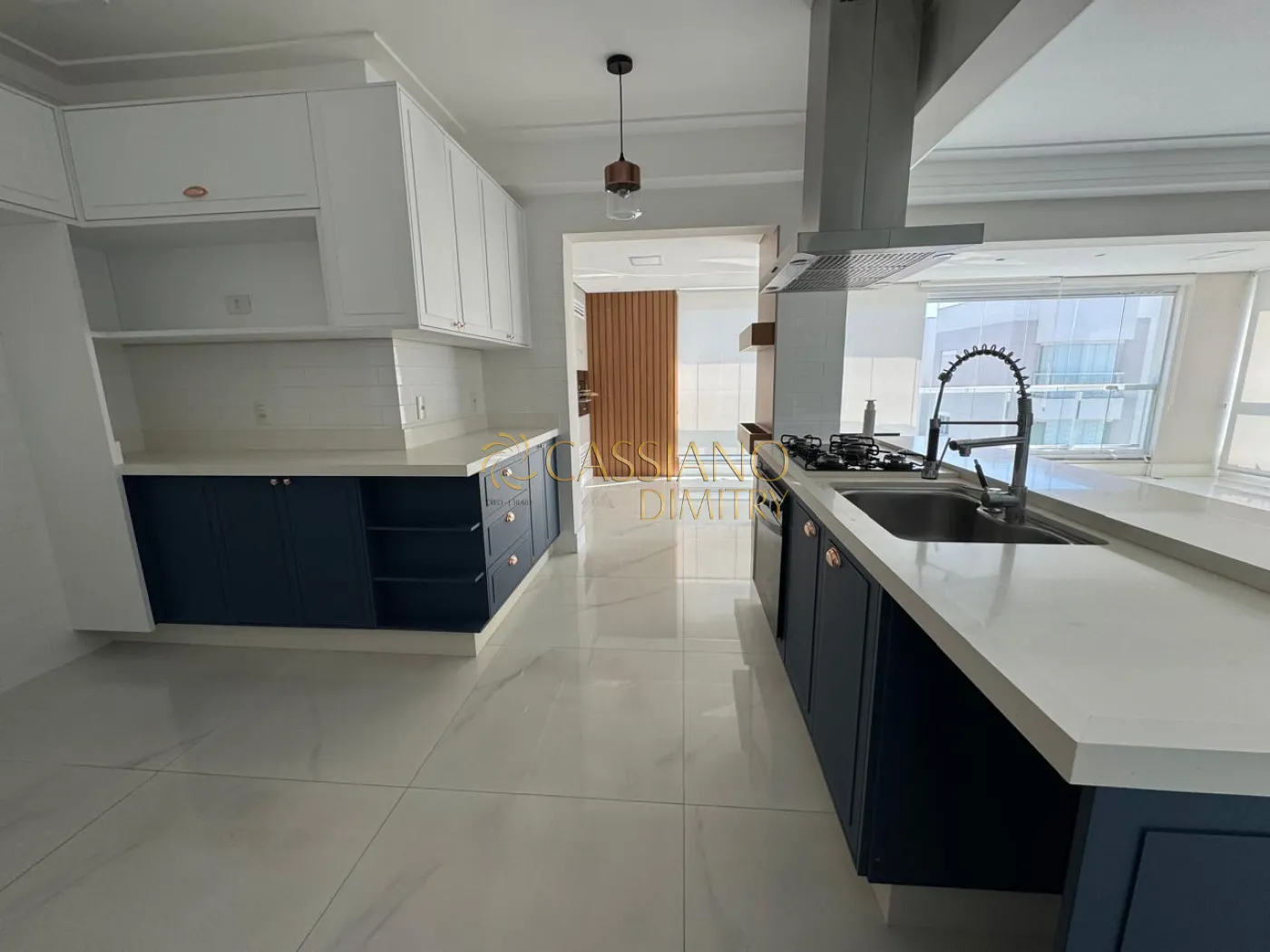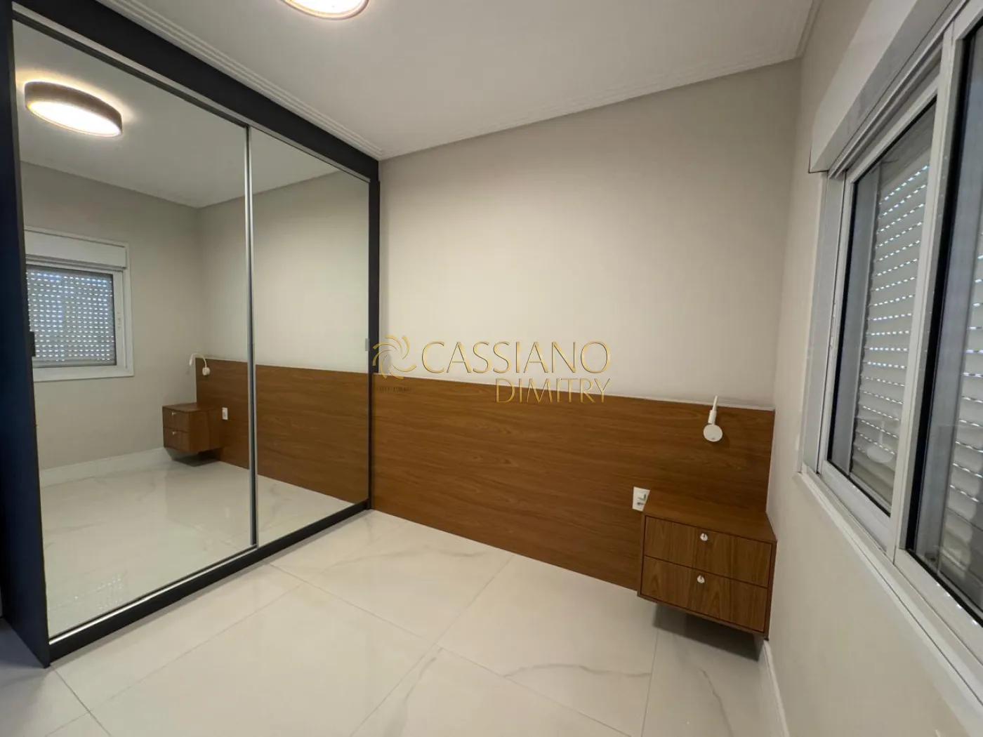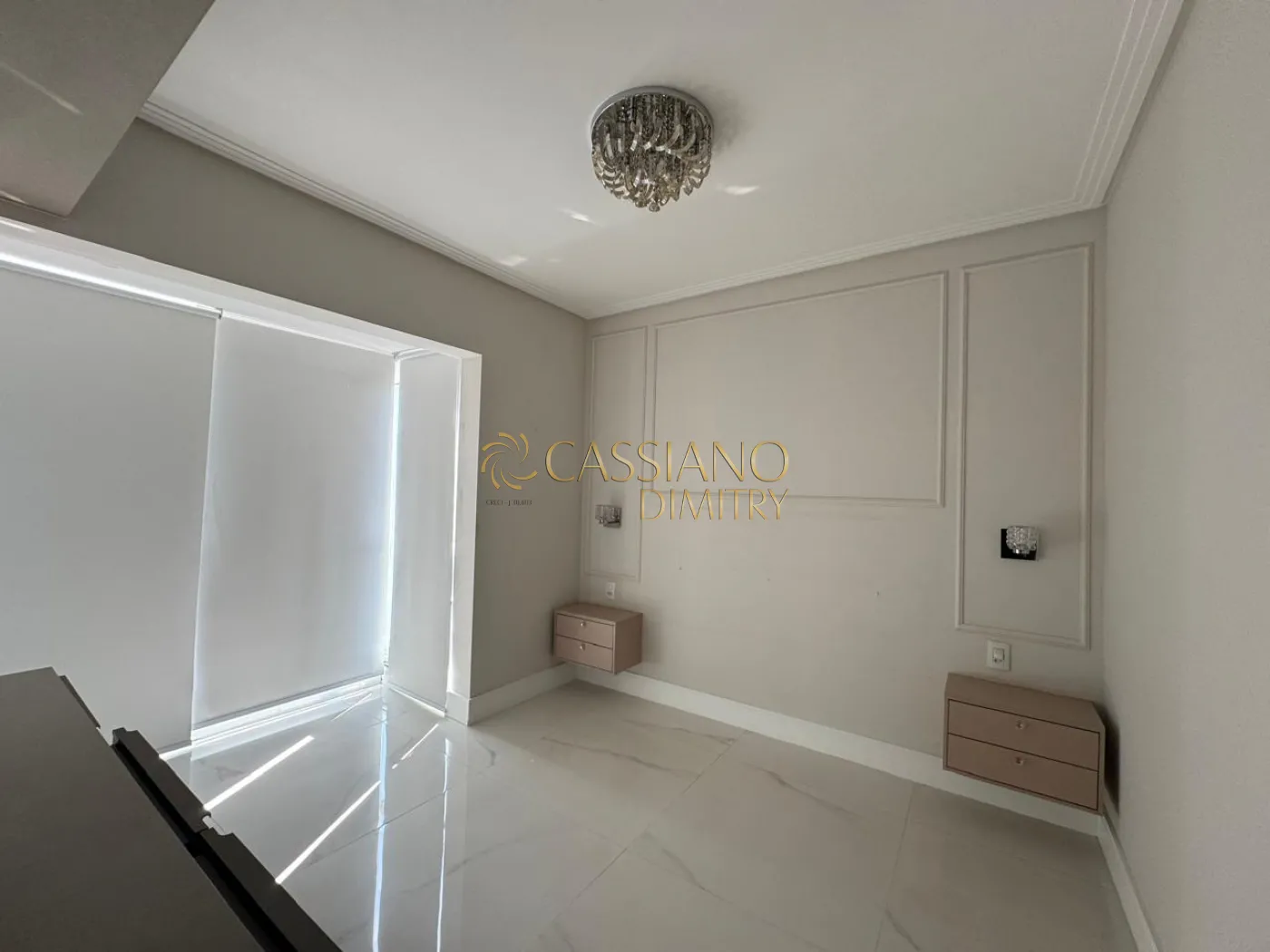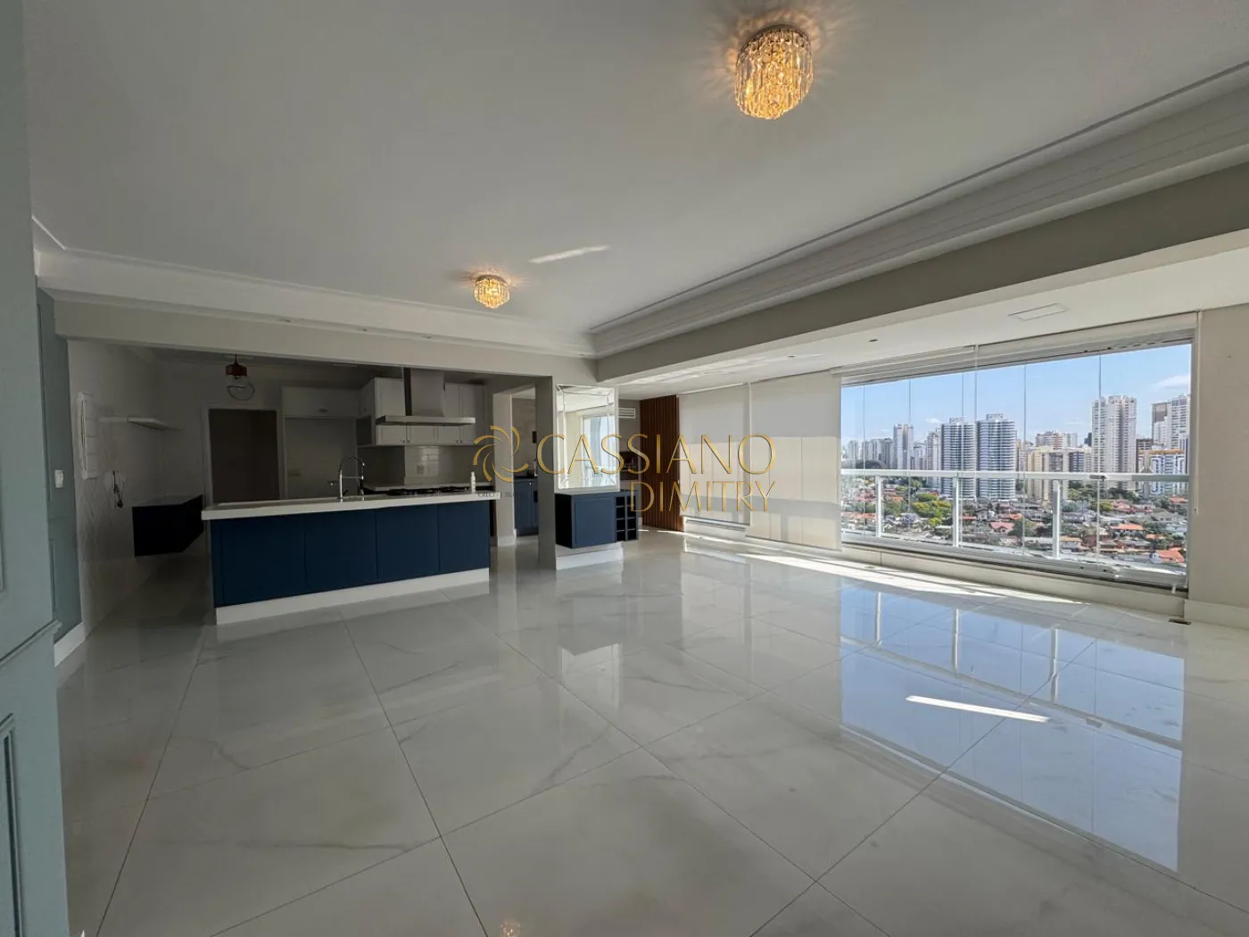- Living amplo com piso em porcelanato polido, marcenaria sob medida e iluminação;