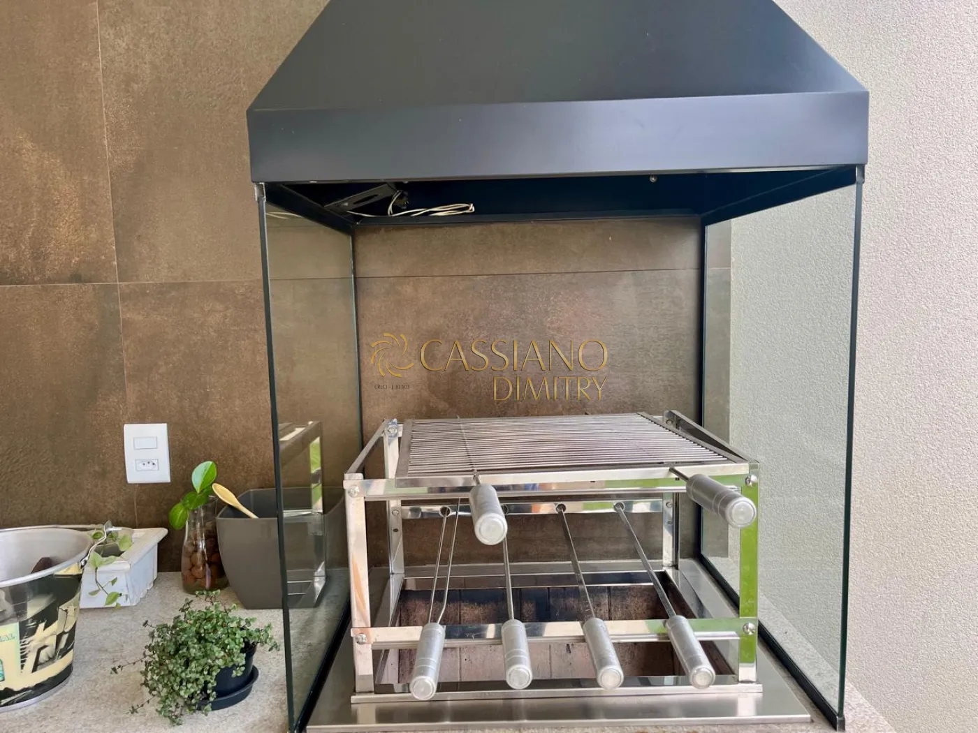 - Varanda com churrasqueira de vidro e coifa preta;