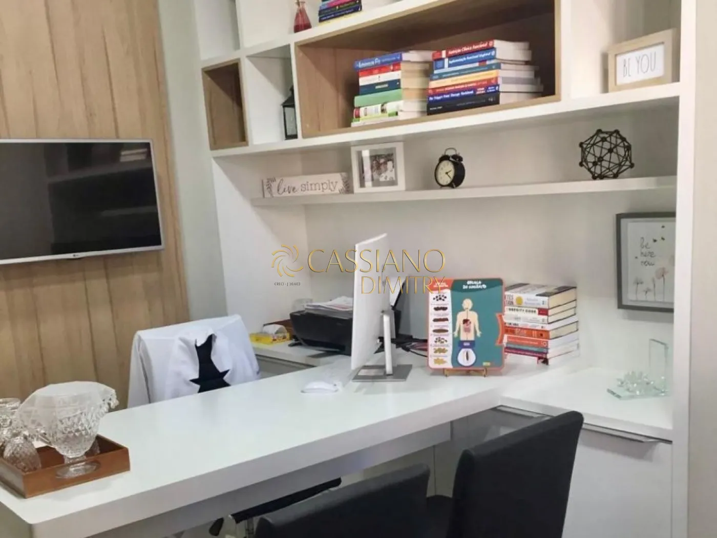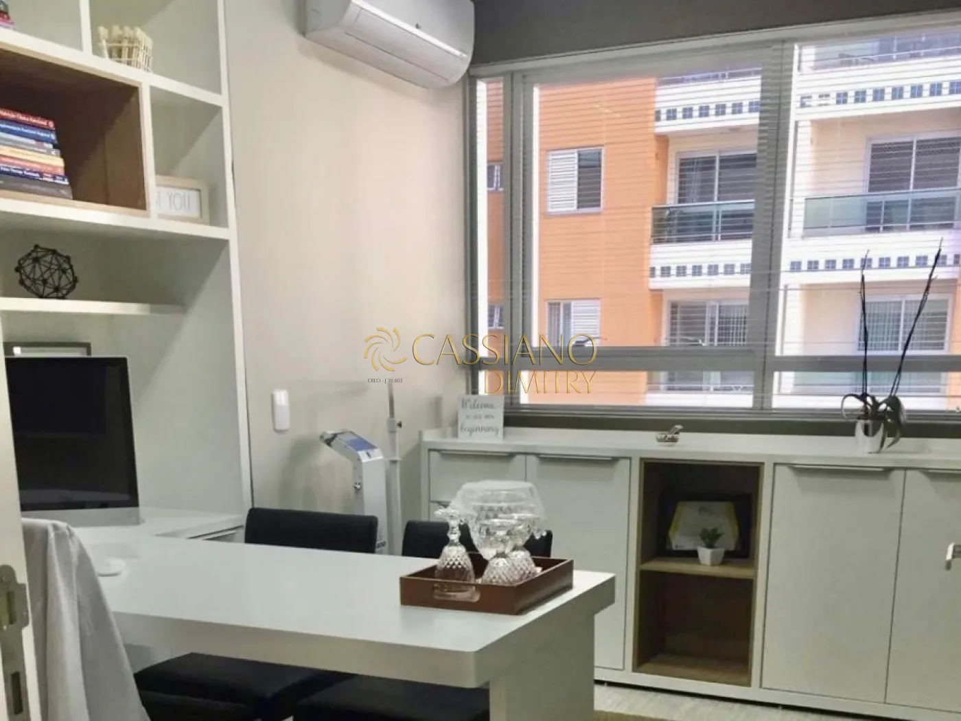 - Estante, armários, mesas, persianas, aparelho de tv, balcão de secretária;