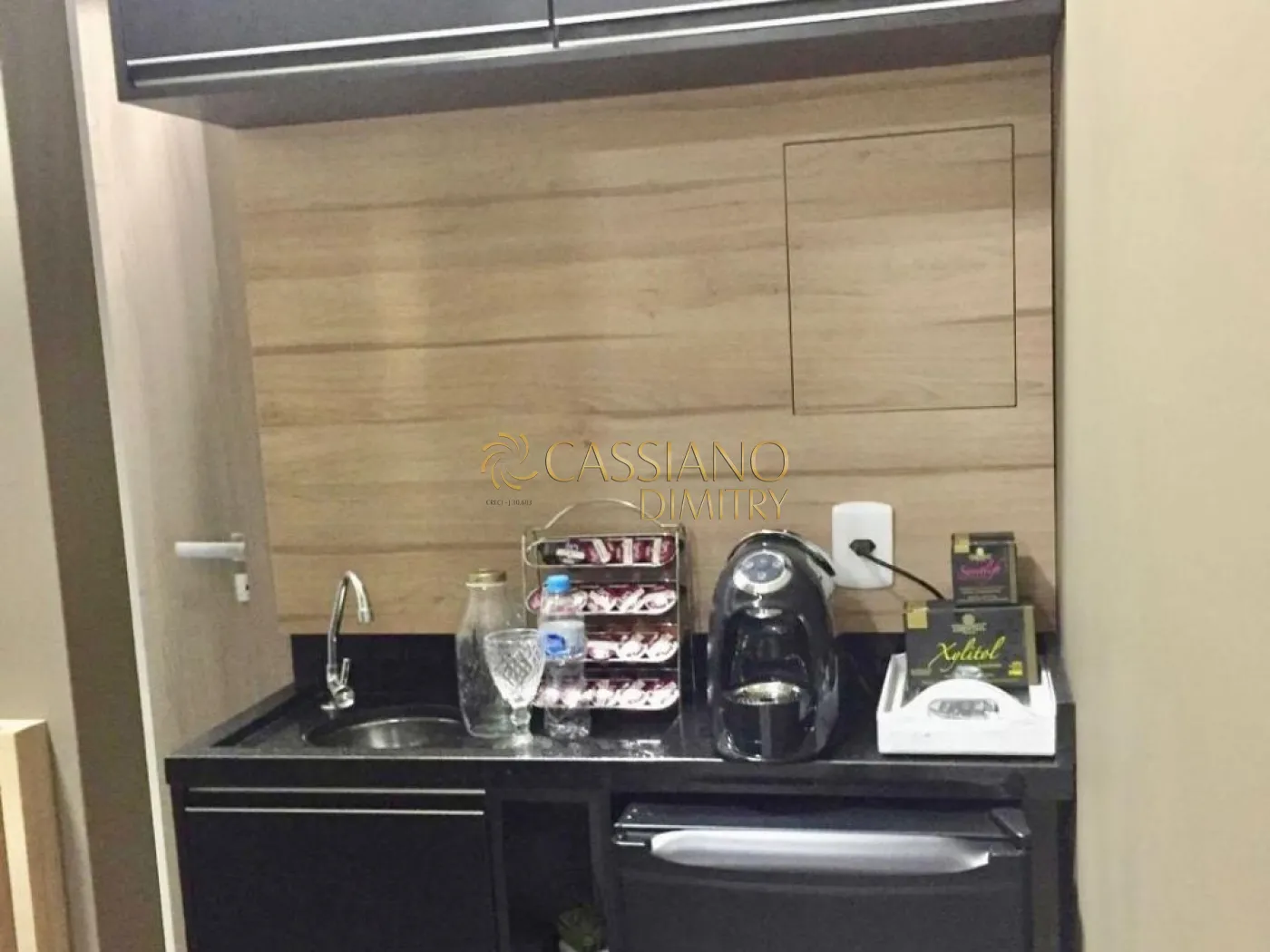 - Cozinha com balcão, pia, geladeira, armário e prateleiras;